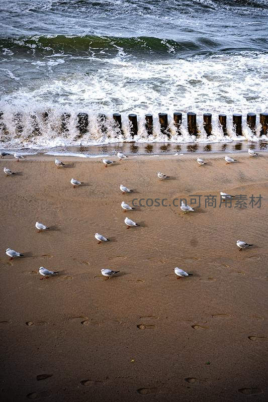 一群洁白的海鸥悠闲地散落在湿润的沙滩上,身后是不断涌来的白色浪花,它们拍打着一排整齐的黑色防波木桩,构成一幅生动的海滨生态图景。