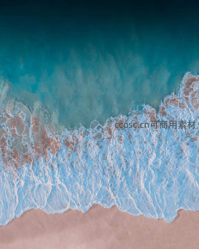 从空中俯视,洁白细腻的浪花如雪般覆盖在粉金色沙滩边缘,海水由深蓝渐变至浅绿,构成一幅诗意而梦幻的海滨画卷。