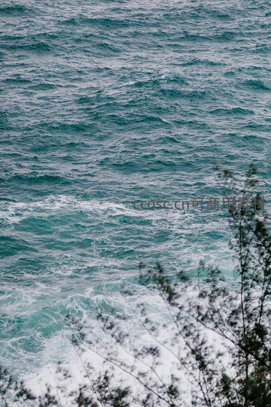从高处俯瞰,深蓝色的海水翻涌着白色浪花,岸边树木枝叶随风轻摆,构成一幅宁静而充满生命力的海滨画卷。