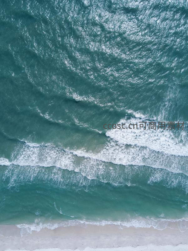 从空中俯瞰,碧蓝海水与洁白沙滩形成鲜明分界,层层海浪如丝带般铺展,展现出海岸线壮阔而有序的自然韵律。