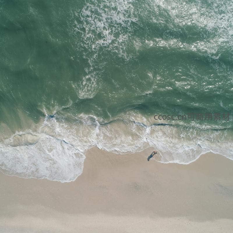 航拍视角下,一人独行于金色沙滩,温柔的海浪轻抚脚边,画面充满宁静与自由的度假氛围。