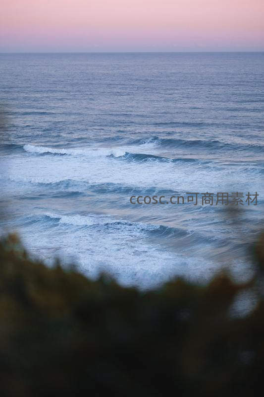 透过前景植物的虚化轮廓,远眺暮色中的海面,层层波浪在粉紫色天空下缓缓推进,意境悠远宁静。