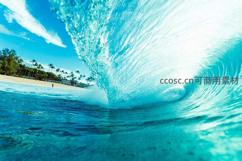 蔚蓝海浪翻涌成弧形水幕,远处沙滩上棕榈树成行,晴空万里无云,展现热带海滨的壮丽与宁静。