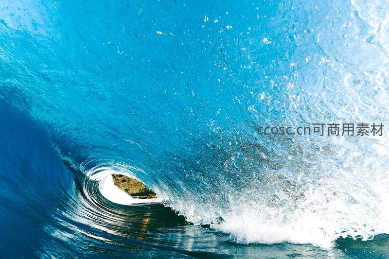 从卷曲的浪管内部向外望去,阳光穿透碧波,远处小岛隐约可见,营造出如梦似幻的水下视觉奇景。