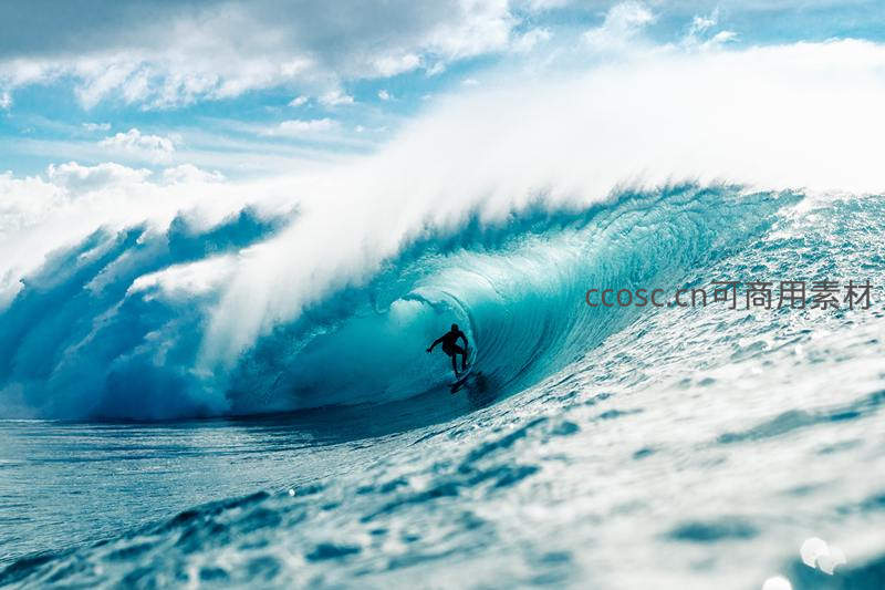 一名冲浪者在巨大而透明的蓝色海浪中穿行,浪花飞溅,背景是晴朗的蓝天白云,展现了人与自然力量的壮丽对决。