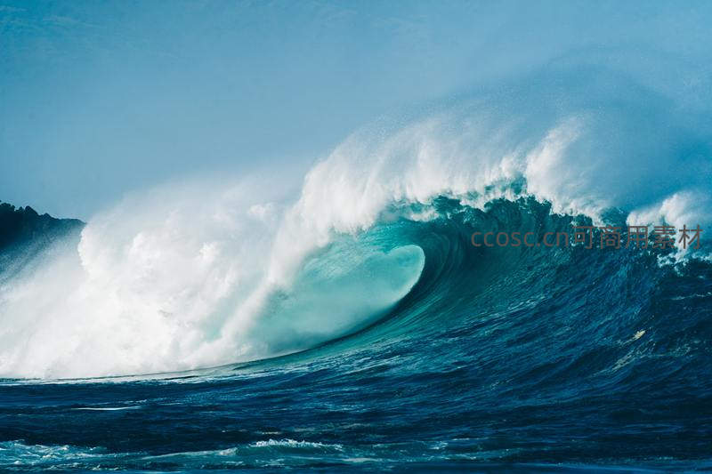 一堵巨大的海浪正在猛烈翻滚,浪尖破碎成雪白泡沫,深蓝海水与天空形成强烈对比,彰显大自然原始而震撼的威力。