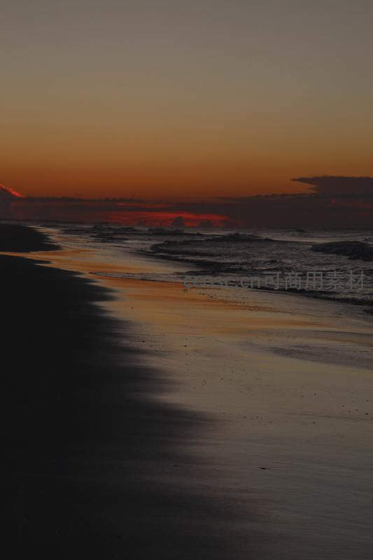 暮色降临,橙红色的晚霞染遍天际,海浪轻抚着湿润的沙滩,营造出一片静谧祥和的海滨黄昏景象。