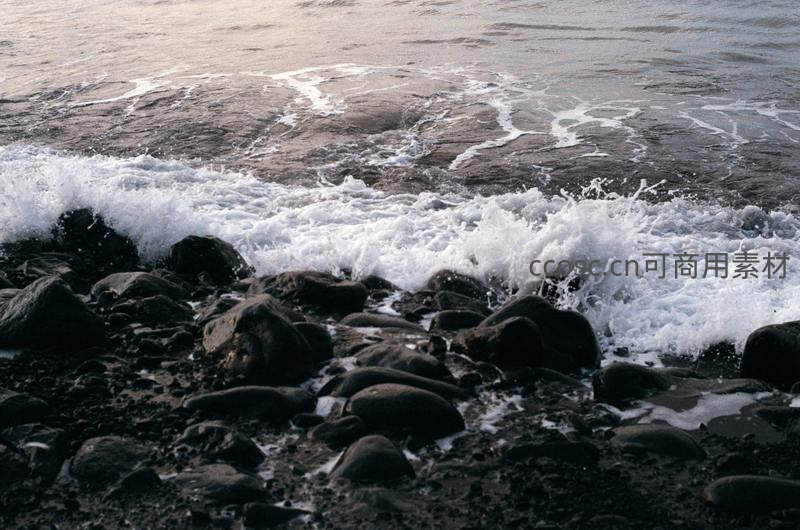 汹涌的海浪猛烈冲击着布满黑色圆润礁石的海岸,激起大量白色泡沫,展现了大自然原始的力量与粗犷之美,充满动感与视觉冲击。