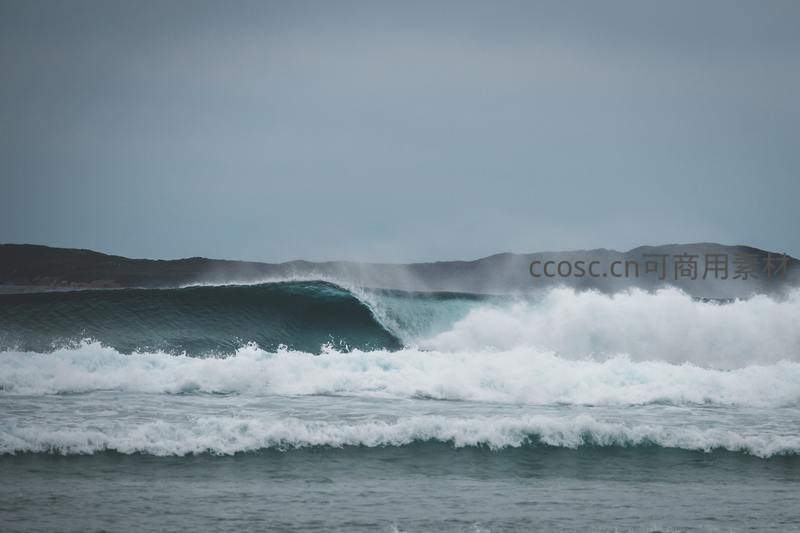 巨浪翻涌海岸线,水花四溅显壮阔