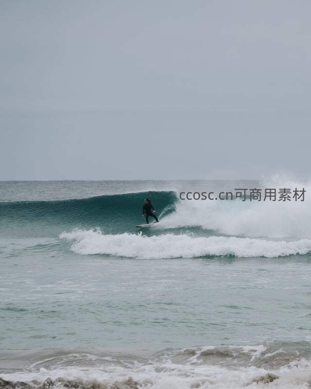 冲浪者在清澈海水中稳立板上,顺着弧形浪壁滑行,浪花飞溅如云,背景是平静海面与灰白天空,诠释人与自然的和谐共舞。