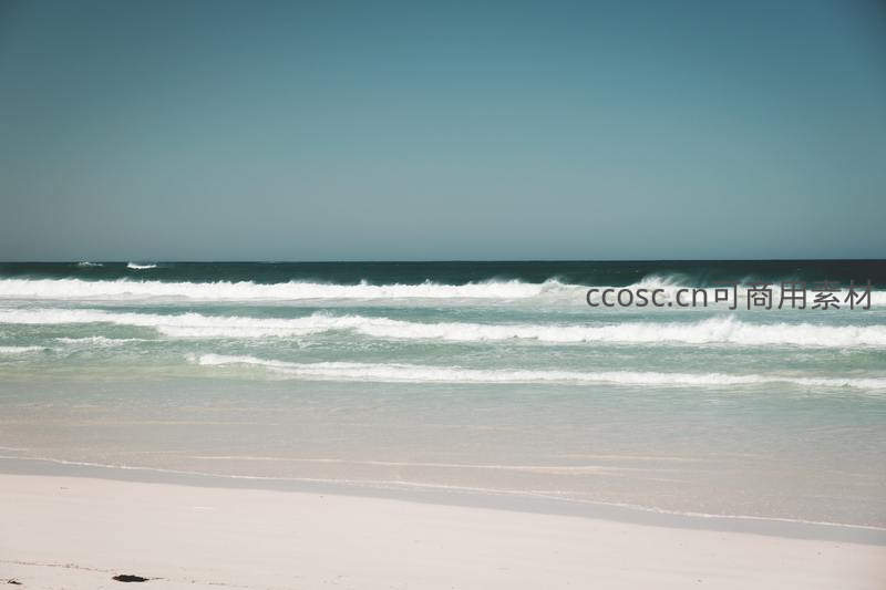 洁白细腻的沙滩延伸至远方,碧蓝海水轻柔地拍打着岸边,层层叠叠的白色浪花缓缓推进,营造出平和安逸的海滨氛围。