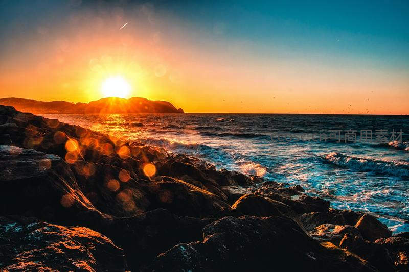 金色的夕阳沉入远方山峦,将海面染成一片辉煌,波光粼粼,前景的黑色礁石被镀上暖光,镜头光斑点缀其间,营造出浪漫而宁静的黄昏氛围。