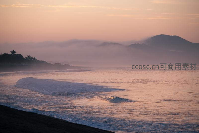 清晨的海岸被薄雾温柔笼罩,柔和的粉紫色霞光洒在海面,层层波浪轻柔地涌向沙滩。远方山丘轮廓若隐若现,近处棕榈树影婆娑,整个场景如诗如画,静谧而治愈。