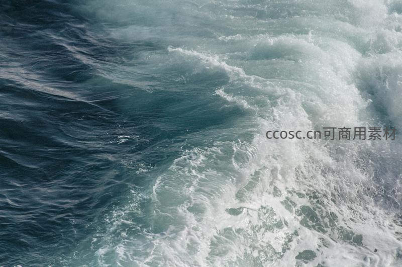 从高处俯瞰,深邃的蓝色海水在力量驱动下剧烈翻腾,卷起层层洁白细腻的泡沫,形成蜿蜒曲折的浪迹,展现出海洋无尽的能量与动态之美。