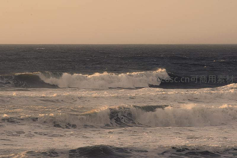 金色的夕阳洒在深蓝色的大海上,层层叠叠的海浪翻滚着冲向岸边,激起洁白的浪花,展现出大自然的磅礴与宁静。