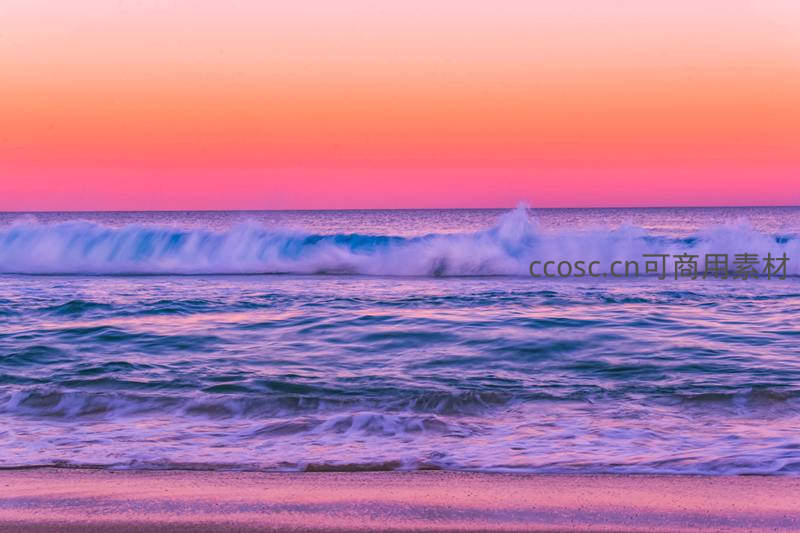 天空被染成梦幻的粉紫色,柔和的光线洒满整个海滩,海浪在绚烂的霞光中翻滚,沙滩也反射出迷人的色彩,构成一幅浪漫画卷。