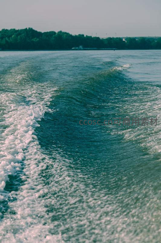 快艇驶过水面留下的蜿蜒白色水痕