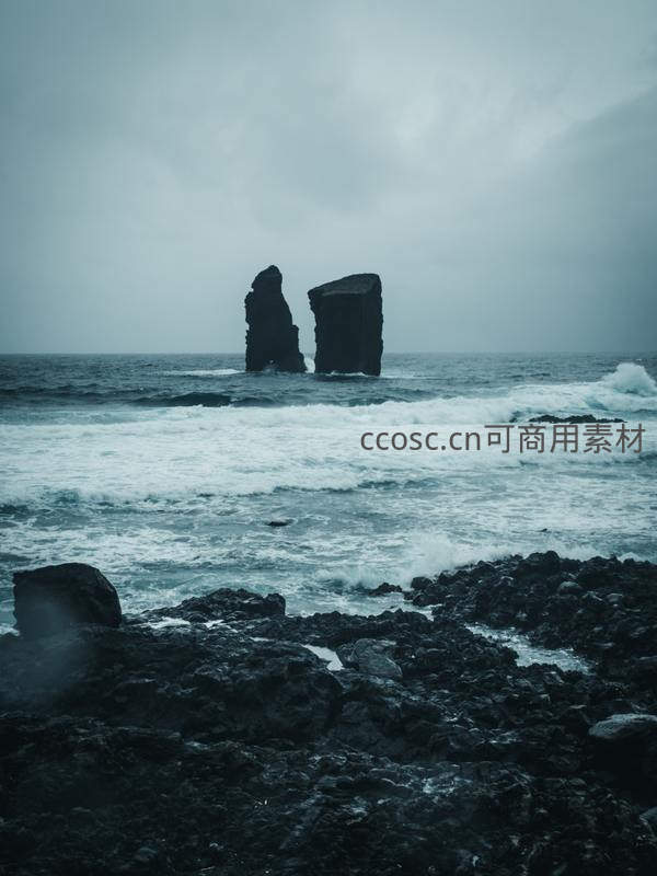 阴沉天空下,两座黑色礁石屹立于汹涌海浪之中,前景是湿漉漉的黑色火山岩,画面充满力量与孤寂感。