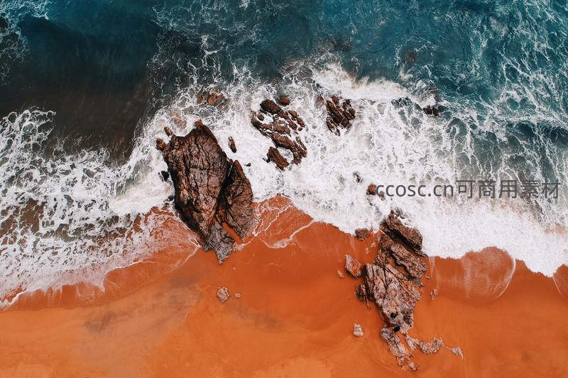 从高空俯瞰,深蓝海水与橙红色沙滩形成强烈视觉对比,白色浪花不断冲击着嶙峋礁石,展现出大自然原始而磅礴的力量。