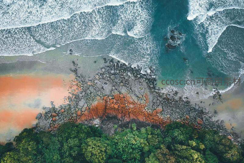 绿林、红滩与碧海交汇的海岸全景航拍图