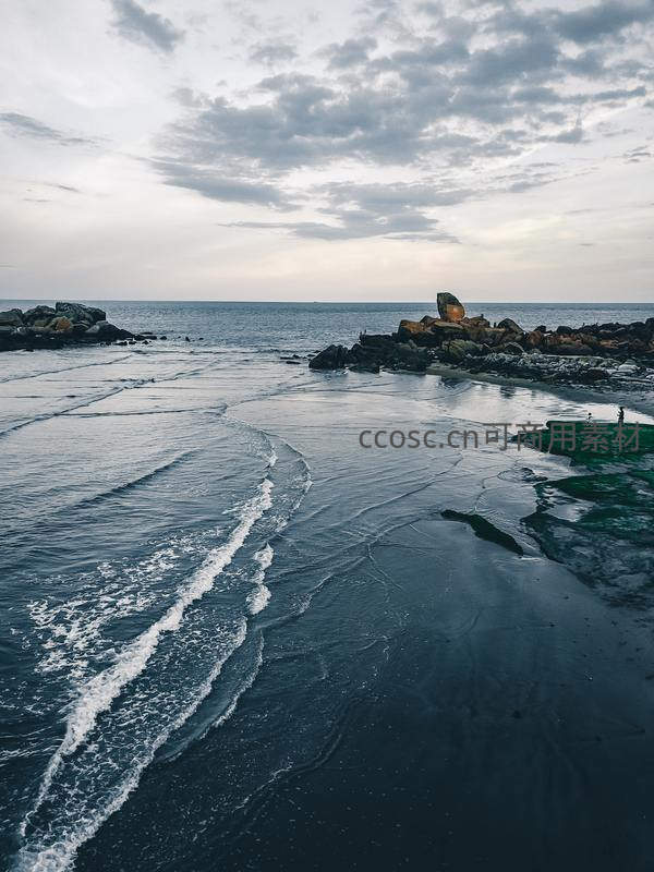 天空云层低垂,深色的海水缓缓漫过湿润的沙滩,远处礁石静默伫立,整个画面弥漫着一种沉静、辽阔又略带忧郁的氛围。