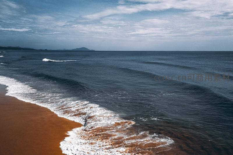 平静的海面泛起层层涟漪,洁白浪花轻吻红褐色沙滩,远处岛屿轮廓隐约可见,营造出开阔而安详的海滨氛围。