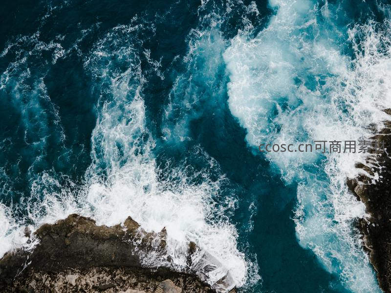 从高空俯视,碧蓝的海水、翻滚的白浪与深色的岩岸相互缠绕,其形态与色彩如同一幅流动的抽象水墨画,充满视觉艺术感。
