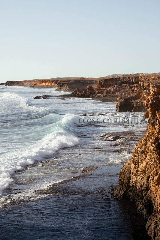 温暖的阳光斜照在崎岖的海岸线上,层层叠叠的浪花温柔地涌向岸边,营造出一种辽阔、宁静且充满生机的海滨氛围。