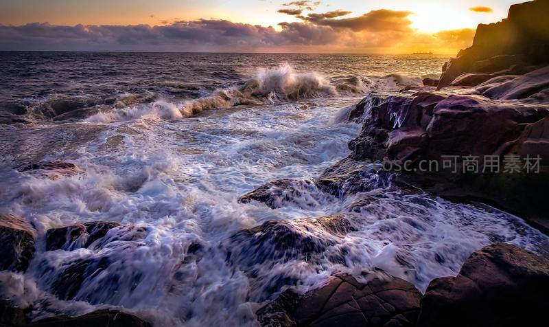 汹涌的海浪猛烈撞击着嶙峋的礁石,激起层层白色浪花,在绚烂的夕阳映照下,整个画面充满戏剧性与自然的力量。