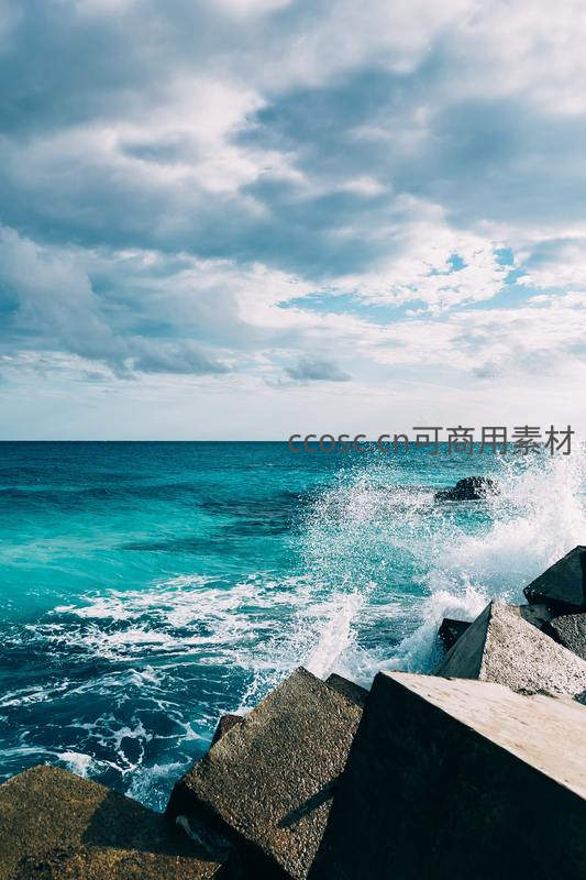 碧海蓝天浪花拍打混凝土堤坝