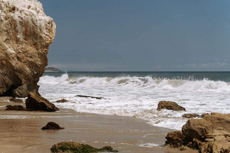 阳光明媚的海岸边,巨大岩壁矗立一旁,汹涌的海浪不断冲刷着沙滩与礁石,激起连绵不绝的白色浪花,充满野性与壮美。