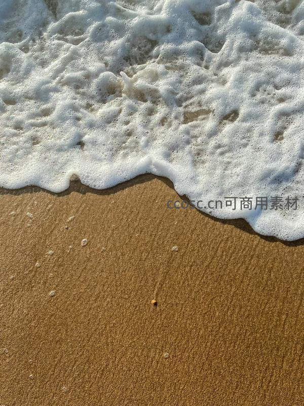 细腻的金黄沙粒上,洁白的海浪泡沫温柔退去,留下湿润的痕迹和微小气泡,捕捉了海边最温柔、最治愈的微观瞬间。
