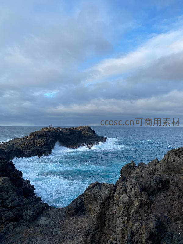 海浪冲击礁石拱门,云层密布天空苍茫