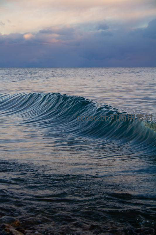 在黄昏柔和的光线下,一道完美的海浪正优雅地卷起,水波纹理清晰可见,天空云彩倒映其中,营造出宁静而富有动感的画面。