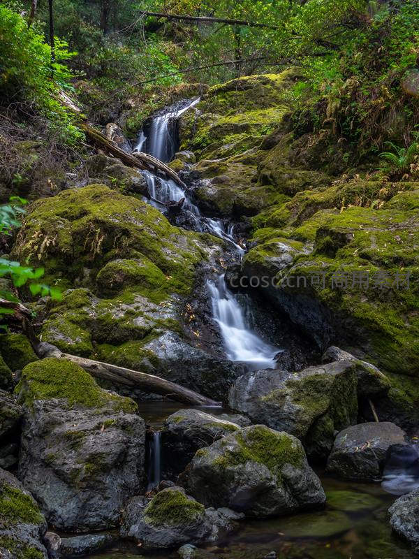青苔覆盖的岩石间飞流直下的山涧瀑布