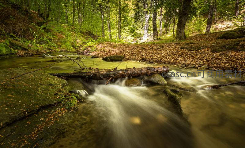 清澈溪水在林间蜿蜒流淌,冲刷着布满青苔的岩石,阳光透过树冠洒下斑驳光影,营造出静谧而生机勃勃的自然氛围。