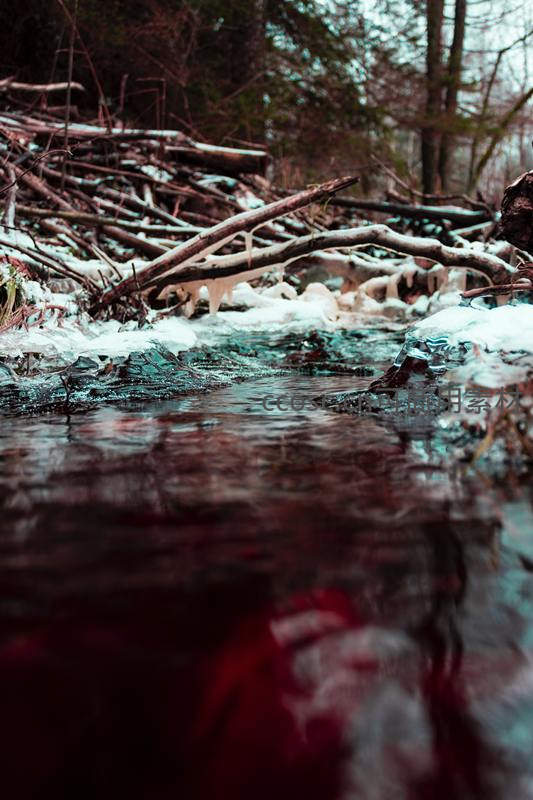 低角度拍摄结冰的溪流,水流在覆雪的枯枝与冰凌间穿行,冷色调营造出静谧而略带神秘的冬日森林氛围。