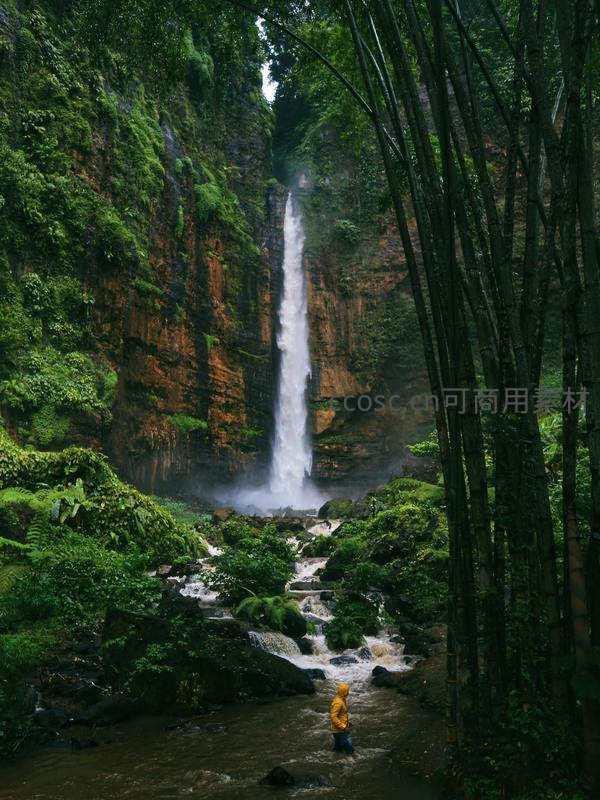 高耸瀑布从陡峭岩壁奔腾而下,四周被茂密雨林环绕,一位身着黄衣的游客站在溪流中仰望,凸显自然之壮美与人之渺小。