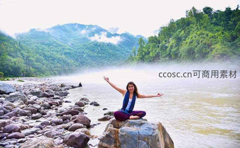 一位女子盘坐于河岸巨石之上,双臂张开闭目冥想,身后是云雾缭绕的青山与宽阔河流,画面传递出人与自然和谐共处的宁静力量。