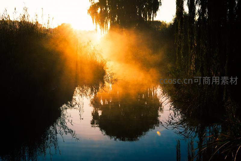 晨雾弥漫湖面,金色阳光穿透柳枝倒影