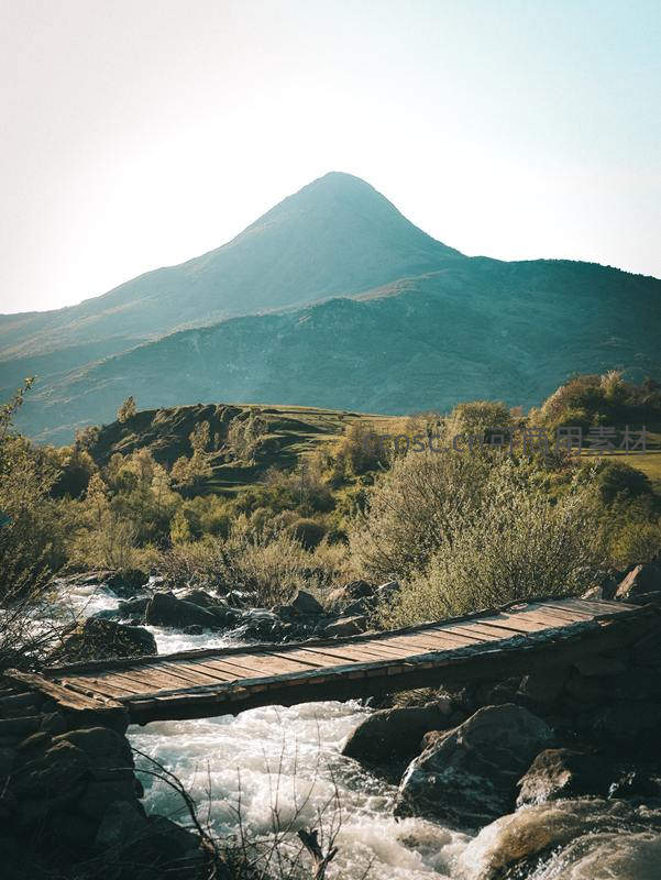 一座简朴的木桥横跨在奔腾的山涧之上,背景是巍峨的青翠山峰,阳光洒落,溪水与绿植交织,构成一幅宁静而壮丽的自然画卷。