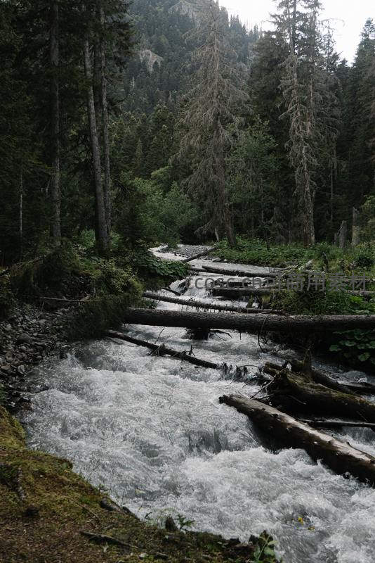 茂密针叶林中,湍急溪水冲刷着倒伏的枯木与湿滑岩石,水花四溅,光影幽暗,展现出原始森林中生机勃勃又略带神秘的自然力量。
