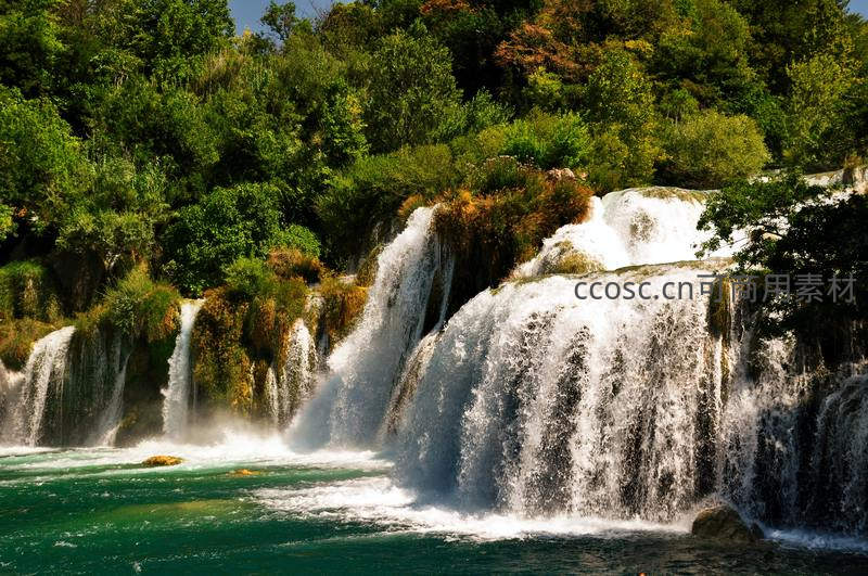 多级瀑布在阳光照耀下奔腾而下,溅起晶莹水花,汇入下方碧绿如玉的深潭,周围植被葱郁,光影交错,展现出大自然磅礴而温柔的力量。
