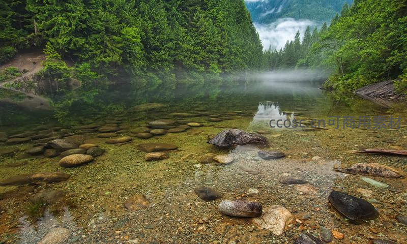 清晨的薄雾轻抚着平静的湖面,四周苍翠的松林倒映其中,水底卵石清晰可见,营造出一幅梦幻而宁静的山水画卷。