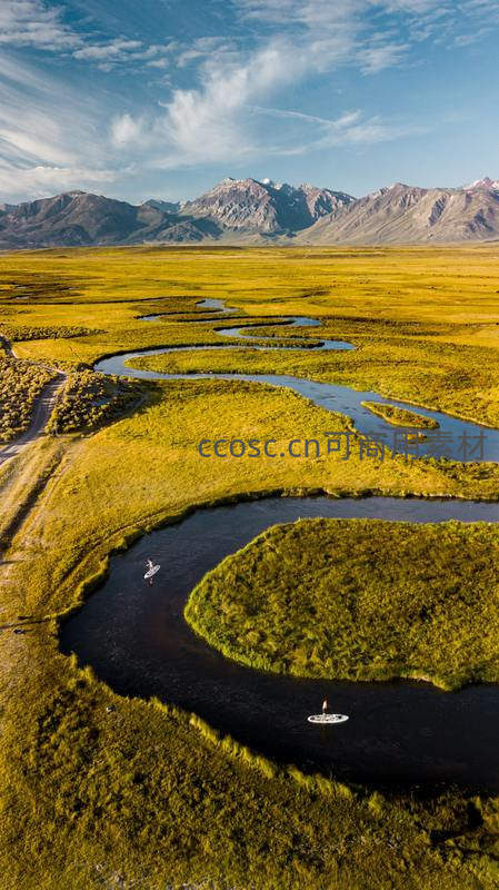 从高空俯瞰,深色河流如丝带般穿梭于金黄色草原之间,远处雪峰巍峨耸立,一人独坐浮板漂流其上,尽显天地辽阔与自然壮美。