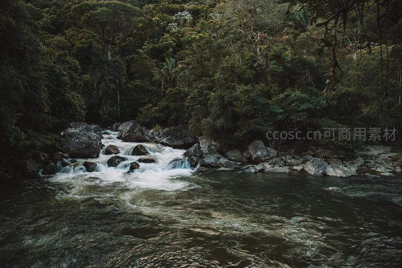 山涧溪流穿石而过,林木葱郁水声潺潺