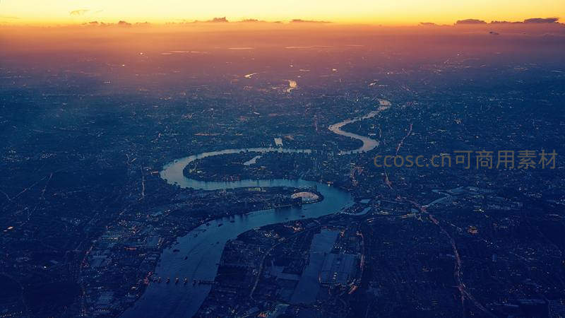 高空俯瞰城市脉络,河流蜿蜒如巨龙盘踞