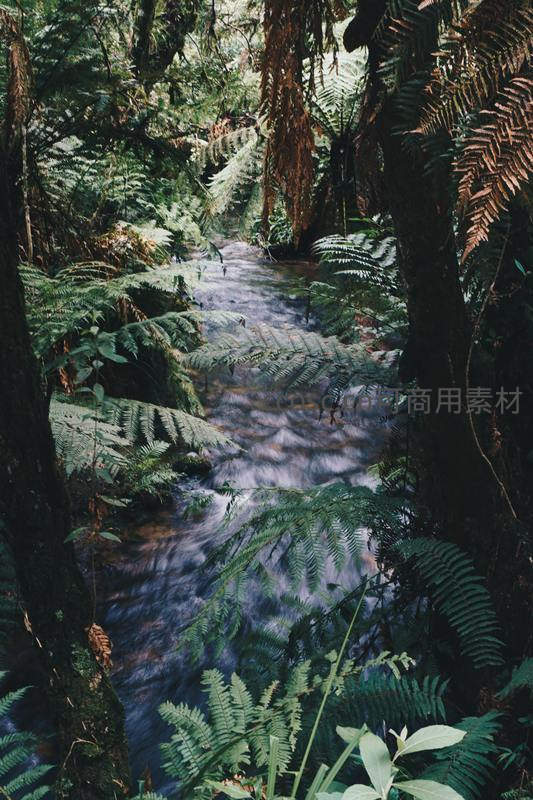 清澈的溪水在郁郁葱葱的热带雨林中蜿蜒流淌,四周环绕着高大的树木和繁茂的蕨类植物,营造出宁静而神秘的自然氛围。