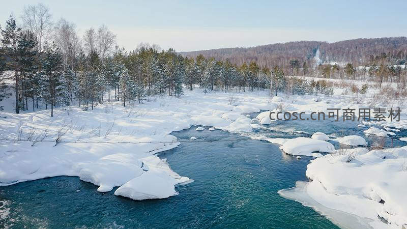 皑皑白雪覆盖两岸,冰蓝色的河水在冻土与松林间蜿蜒流淌,阳光洒落其上,呈现出冬日里宁静而壮美的北国风光。