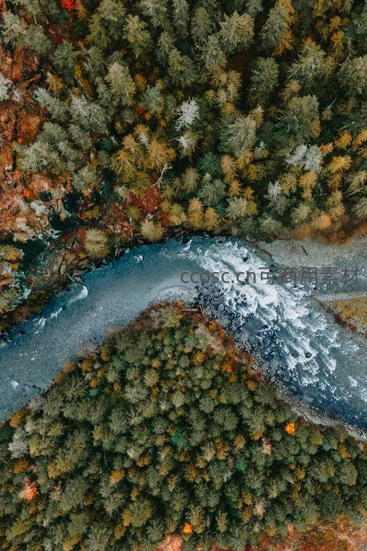 从高空俯瞰,蜿蜒的河流穿行于层林尽染的秋日森林之中,水流湍急激起白色浪花,红黄绿交织的树冠构成一幅壮丽的大地艺术。
